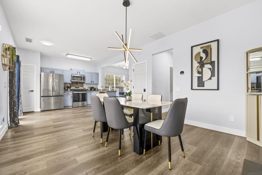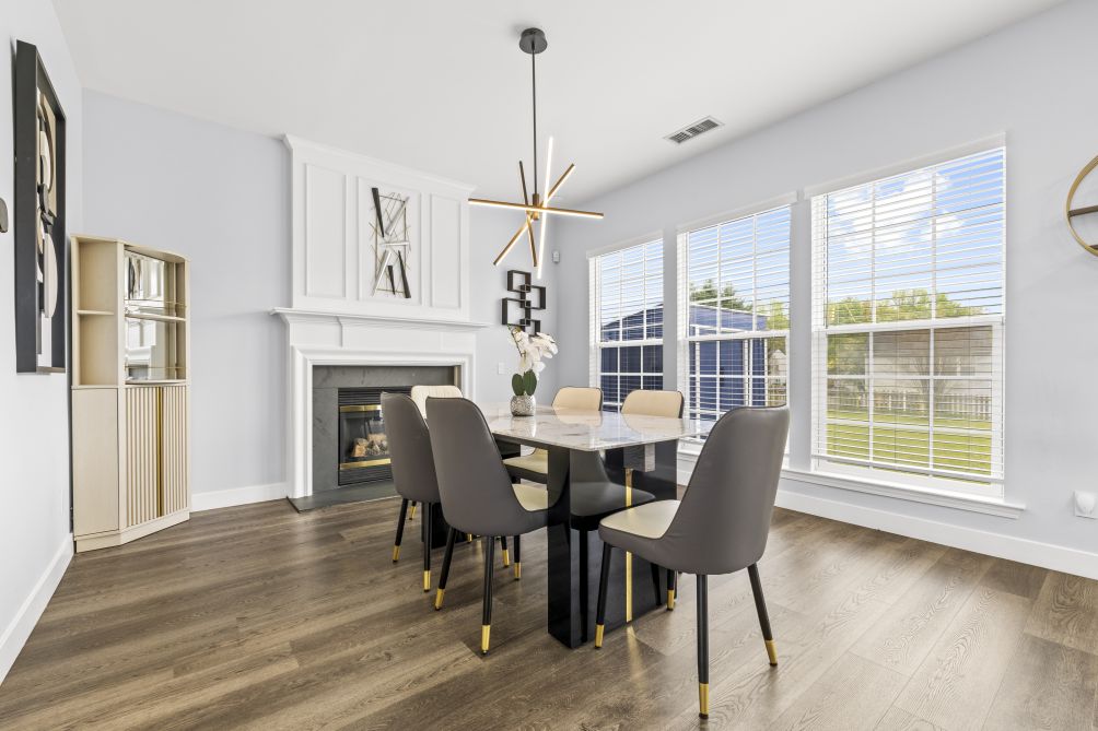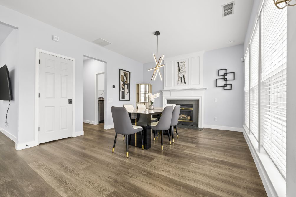 The spacious living room, featuring a smart TV, is perfect for cozy movie nights or lively gatherings. The adjoining dining area boasts a delightful fireplace, creating the ideal ambiance for family meals and special occasions.