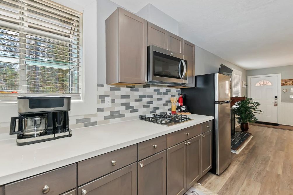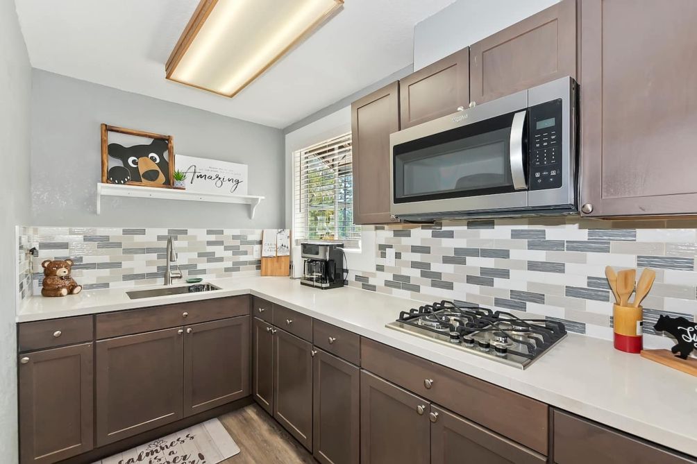 The well-equipped kitchen, complete with spices and all necessary appliances, invites you to create delicious meals to enjoy at the dining table or out on the deck, where stunning mountain views await. For evenings under the stars, gather around the fire pit or fire up the grill for a delightful barbecue experience.