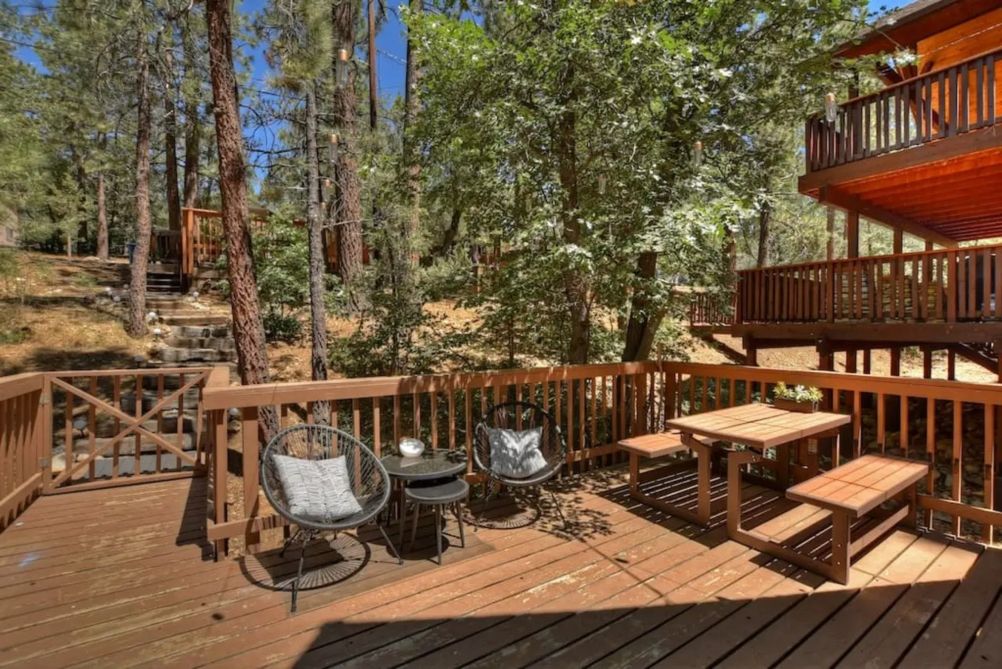 Step outside onto the spacious deck to savor the crisp mountain air. Whether you're grilling on the BBQ or relaxing on the outdoor furniture, the deck is an ideal spot to soak in the stunning natural surroundings. For those who love the outdoors, the cabin's location provides easy access to Big Bear's renowned hiking trails and recreational activities.