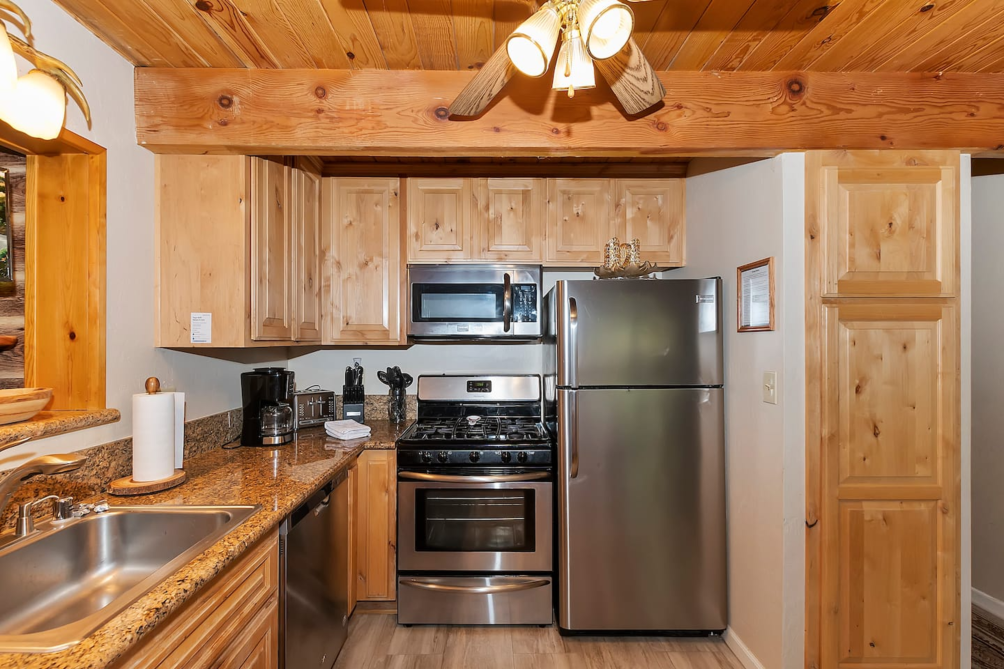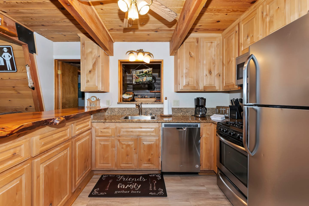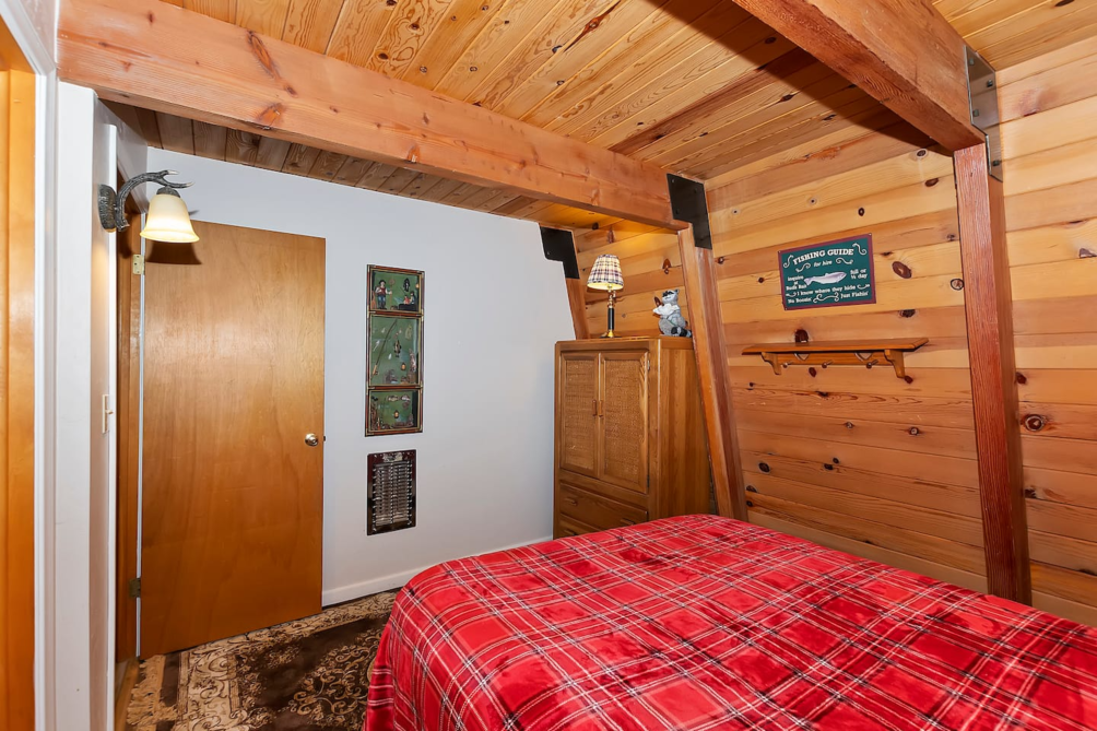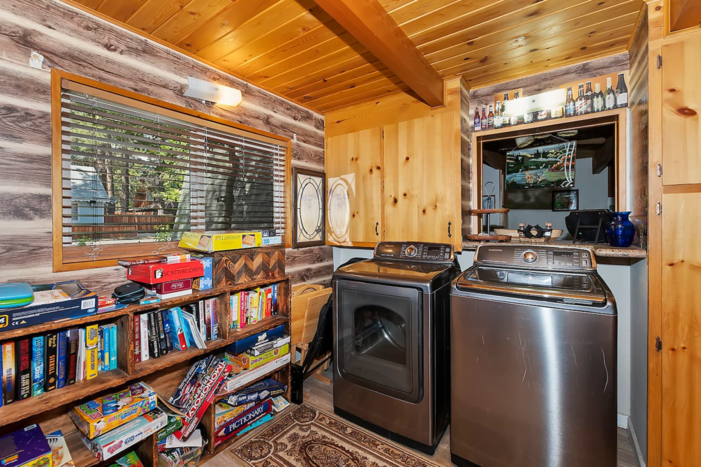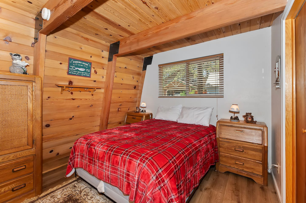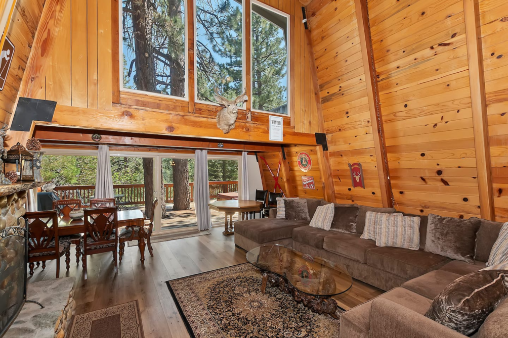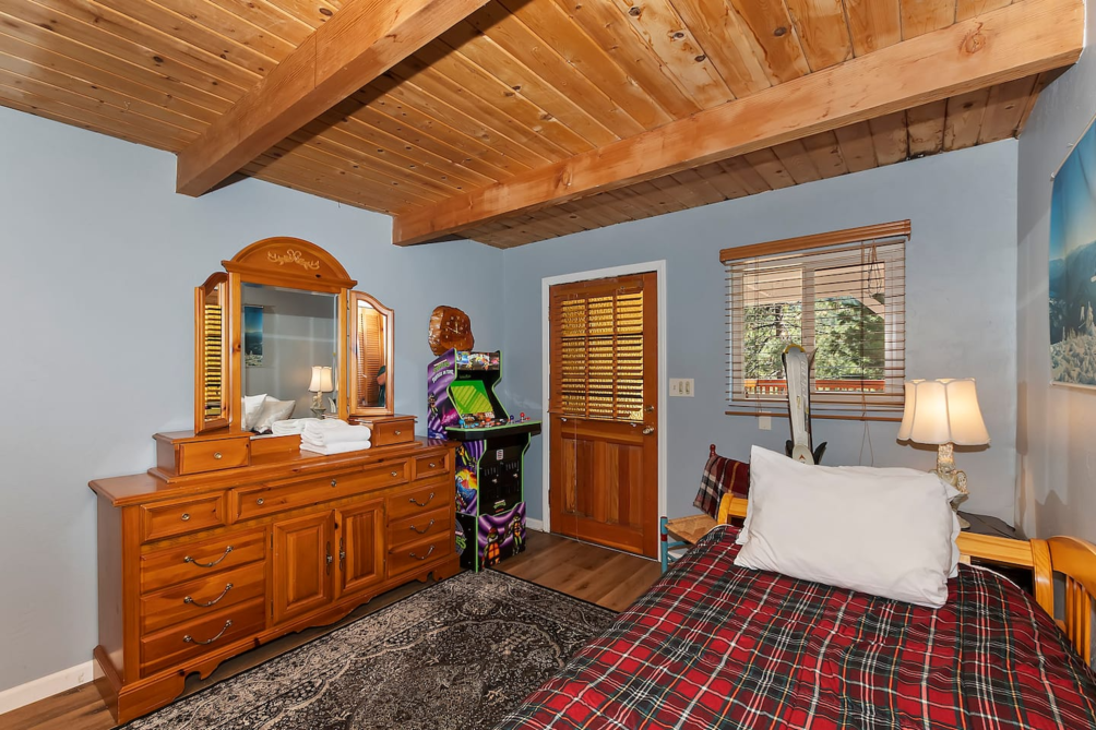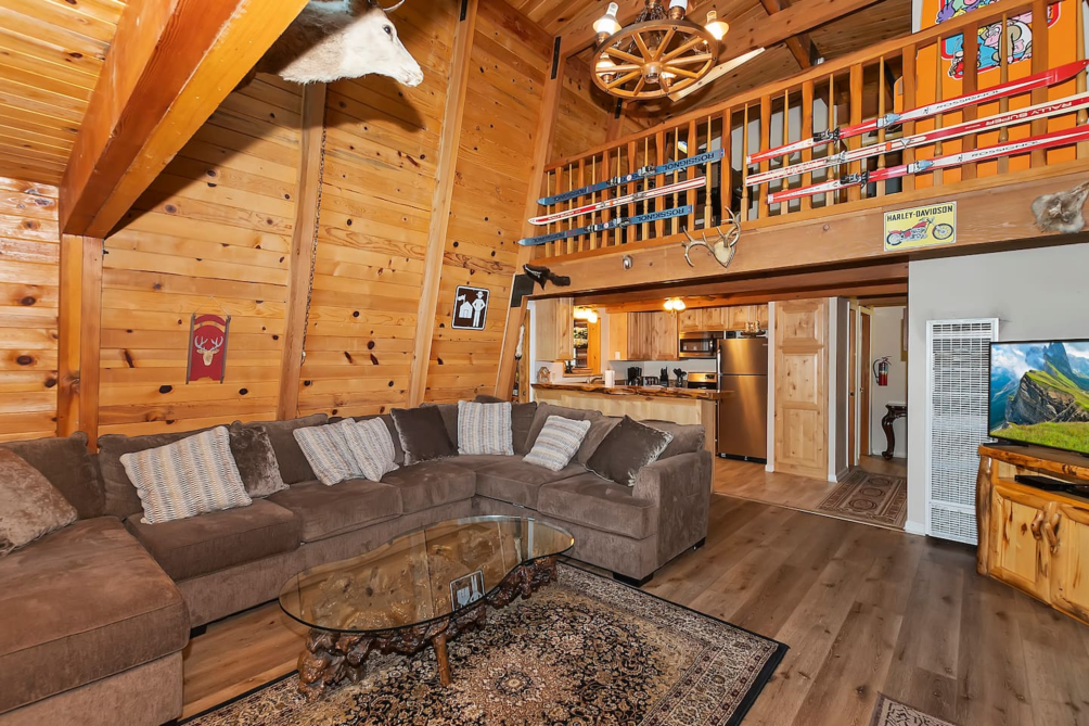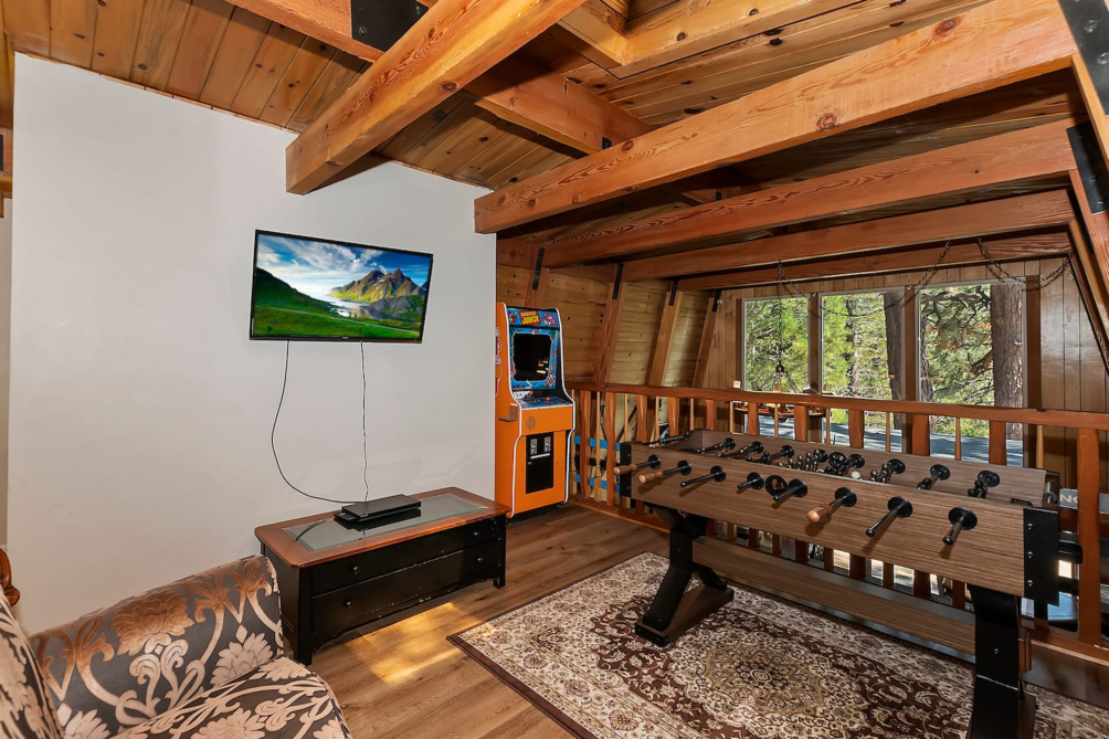 Inside, the main living area boasts vaulted ceilings, large windows, custom chandeliers, and a cozy wood-burning fireplace, furnished with two plush sofas and a TV with cable. Upstairs, a loft area provides additional entertainment with a full-size sleeper sofa, a skylight, a TV with a DVD player and HDMI port, and a full-size arcade featuring classics like Pac-Man, Donkey Kong, and Frogger.