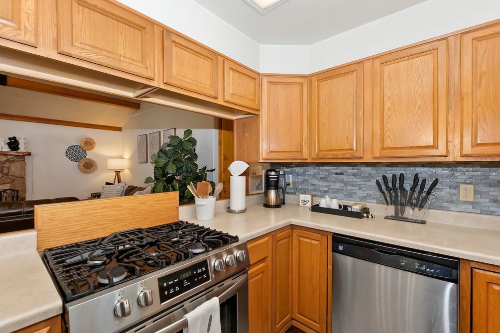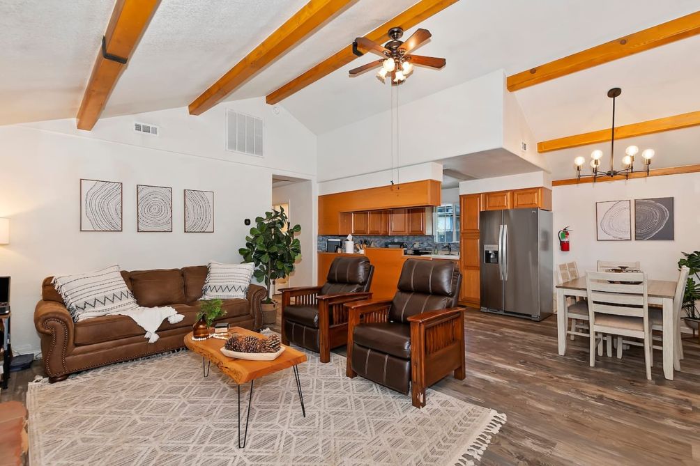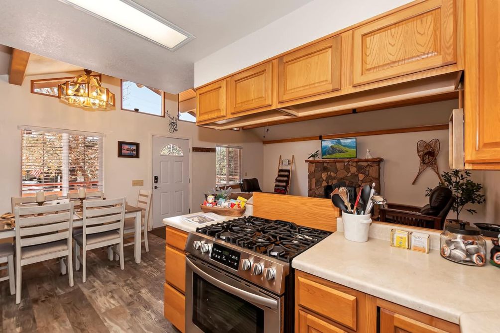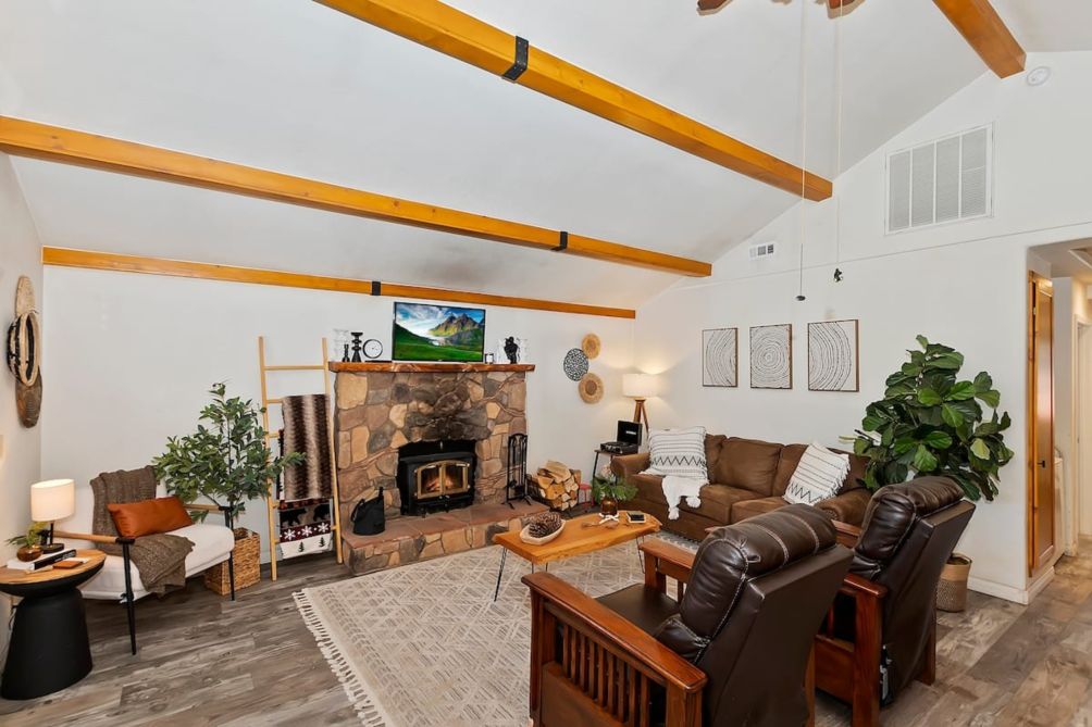 Step inside to an inviting open floor plan where the living area seamlessly connects to the fully equipped kitchen, allowing you to prepare meals while enjoying a movie or quality time with loved ones. The living room features a cozy fireplace, Smart TV, and board games, creating the perfect space to unwind after a day of adventure.