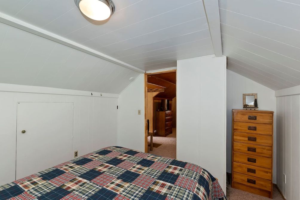 Second Floor: A spacious bedroom featuring a queen bed and two twin beds, ideal for a restful night's sleep.