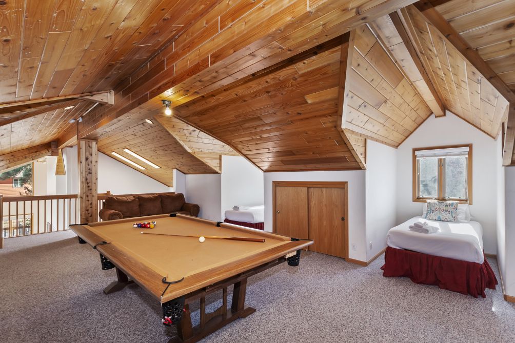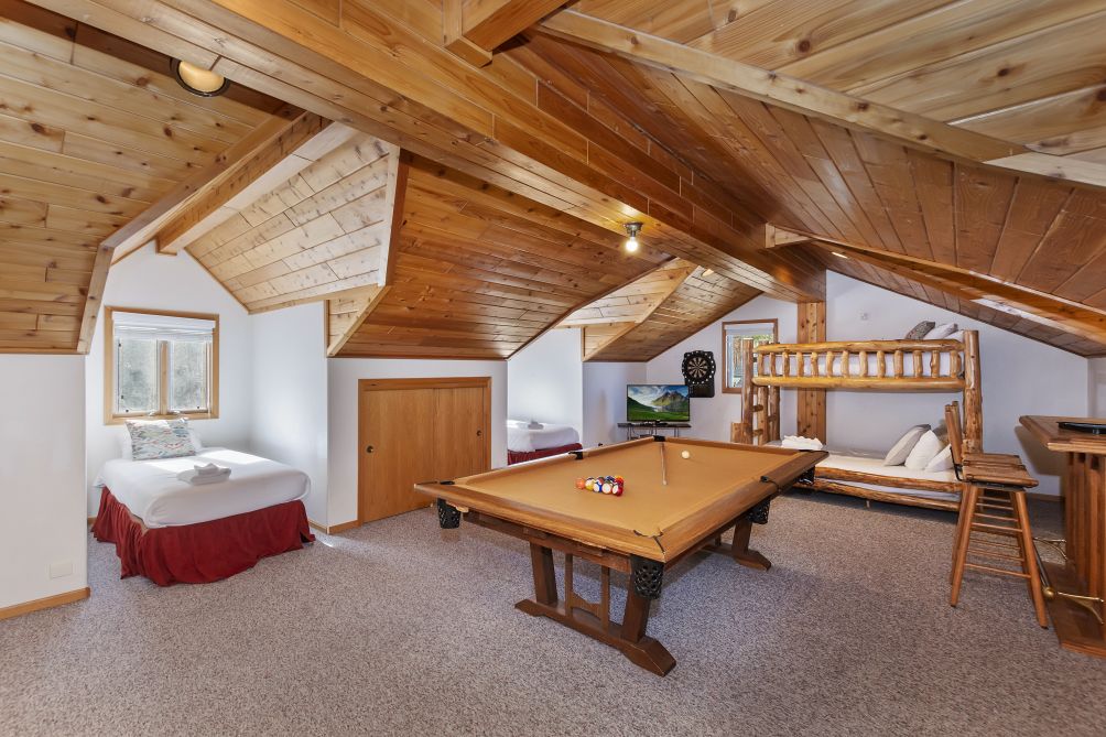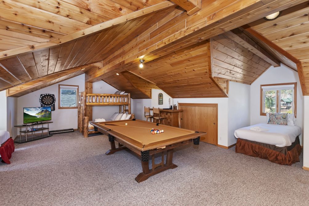 SECOND FLOOR: The second floor is considered the fifth bedroom with a large loft having two large closets behind sliding doors. Accommodations here include three twins (sleeps three) a bunk bed with a twin (sleeps one) on top over a full bed (sleeps two), and a pull-out queen-sized sleeper sofa (sleeps three). There is plenty of room here for additional blow-up mattresses or sleeping bags. The loft includes a full-sized pool table, electronic dartboard, wet bar, a large TV for computer gaming, as well as board games and puzzles. Sleeping a total of up to (8) guests. The kids have their own space upstairs allowing the adults to indulge in conversation, relaxation, and cooking downstairs.
