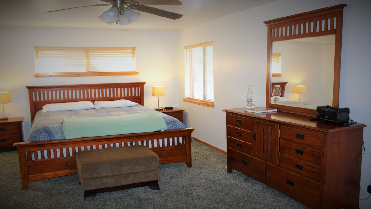 This custom-built 4-bedroom retreat has everything you need for a relaxing and fun-filled getaway. The cozy living room invites you to unwind by the wood-burning fireplace, enjoy a movie on the large flat-screen TV, or simply sink into the plush seating after a day outdoors.