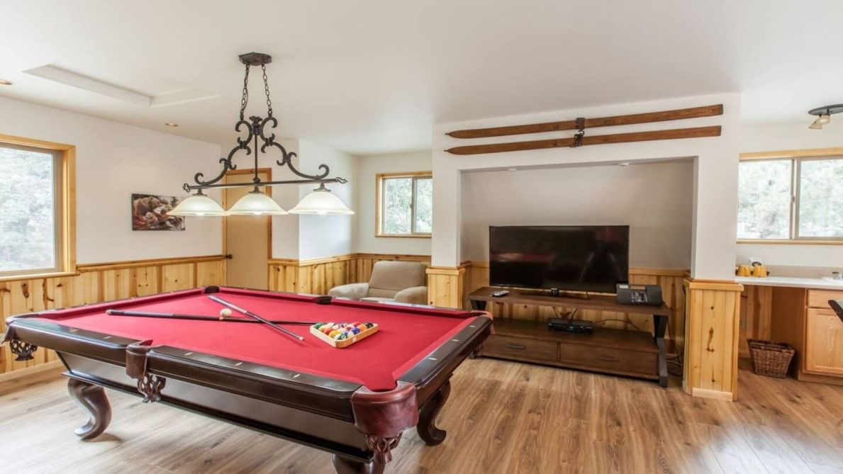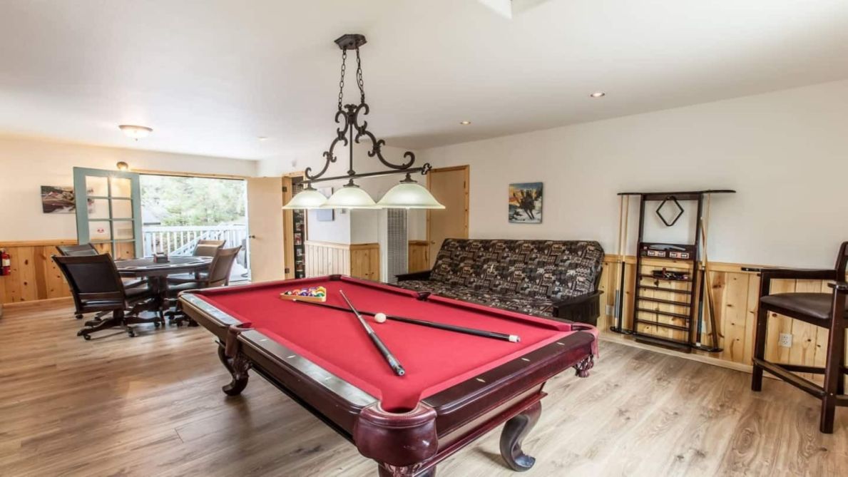Bear Mountain Retreat has plenty of parking and a large, secure garage with ample storage space for your mountain bikes or boat. In the Garage you will also find a Ping Pong Table and Sofas. A great hangout space for the kids! When you’re ready to get out and experience everything Big Bear has to offer, you won’t have to venture far! This house is conveniently situated mere minutes from all kinds of attractions, from skiing, snowboarding, sledding, off-roading, and golfing to mountain biking, hiking, boating and fishing. You can actually walk to the trail head from here! You’ll also be just a stone’s throw away from the zoo, numerous great restaurants, and opportunities for water sports on the lake. No matter what season you plan to visit, this exceptional Big Bear vacation rental house will quickly become a place you love coming home to at the end of the day!