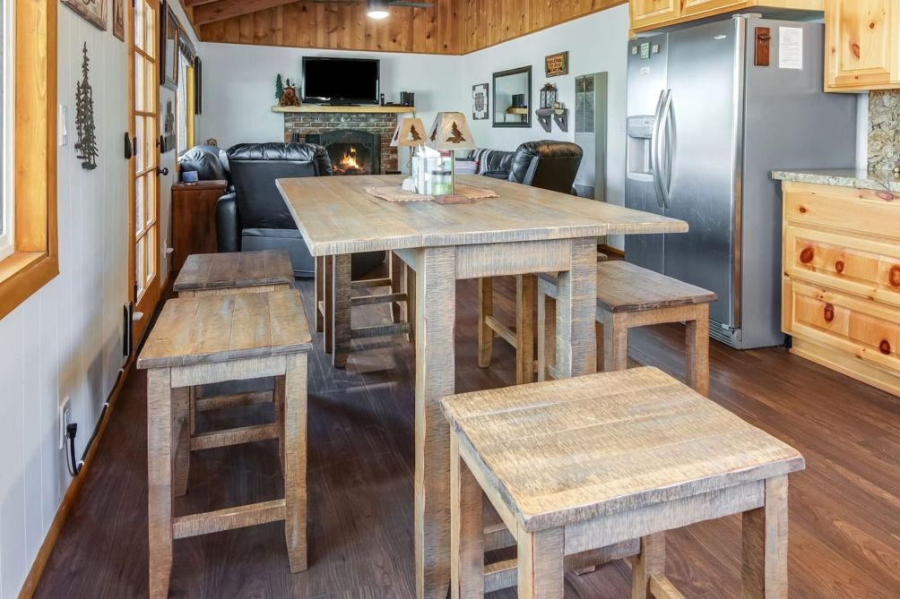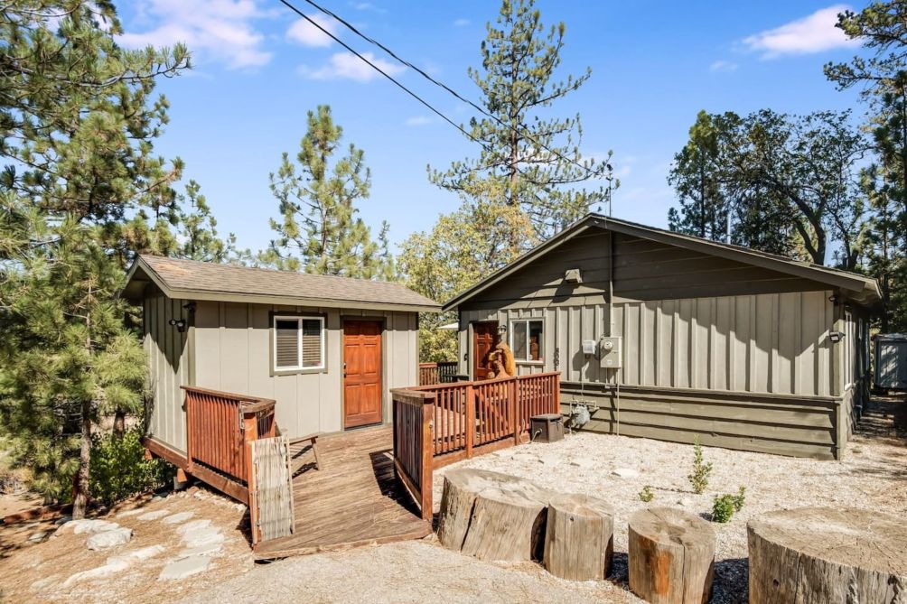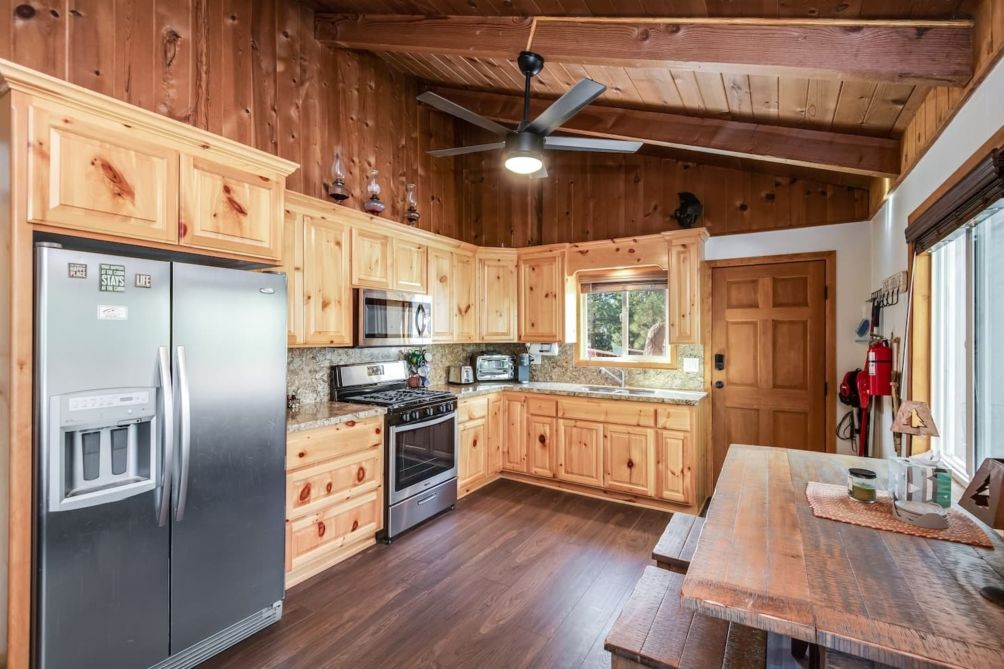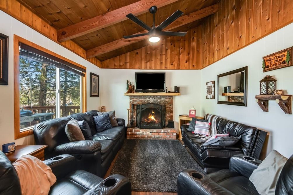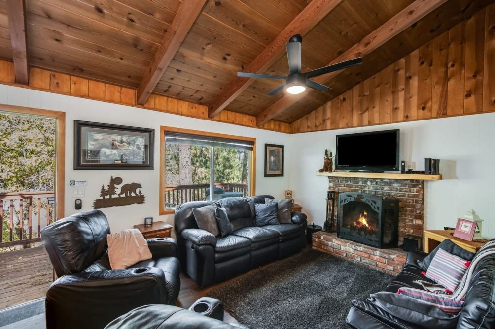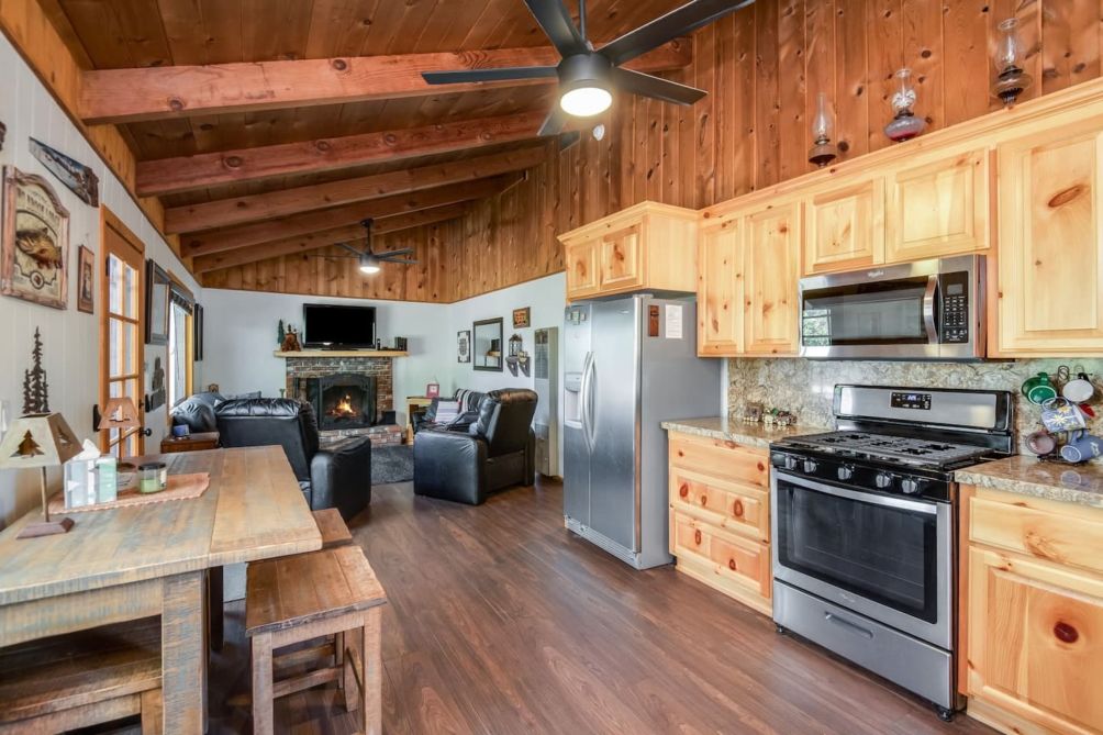 Step into the main house to find a wonderful great room with mountain charm and modern conveniences. The spacious Kitchen is updated and has everything you need - whether you are just making coffee or cooking for the whole group. There is a dining table for sharing a meal or playing games. The Living Room has plenty of comfortable seating, a fireplace, and a smart TV - the perfect place to kick back and relax after a day of fun in Big Bear!!