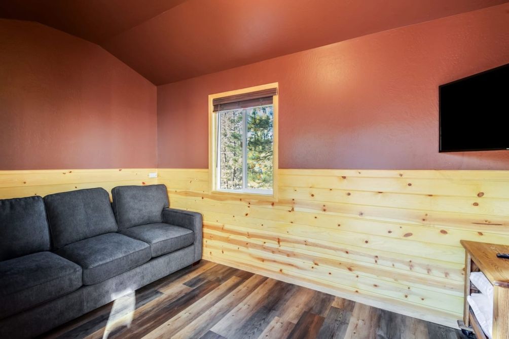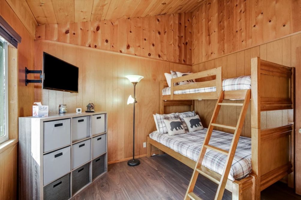 When it is time to call it a night, this cabin has two bedrooms and a full bath. Bedroom 1 has a comfy queen bed. There is a washer/dryer in the closet for your convenience. Bedroom 2 is perfect for another couple or the kids, with a twin over full bunk bed and smart TV. There is also an additional sleeping studio cabin right next to the main cabin that has a fold-flat sofa. The electric fireplace and smart TV here will keep you toasty warm and entertained.