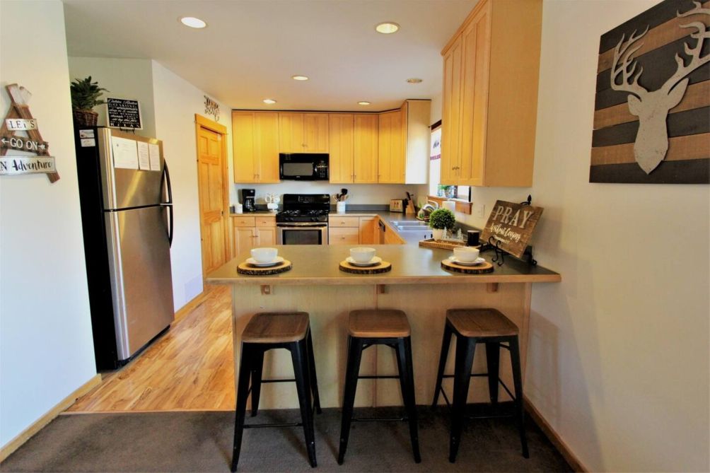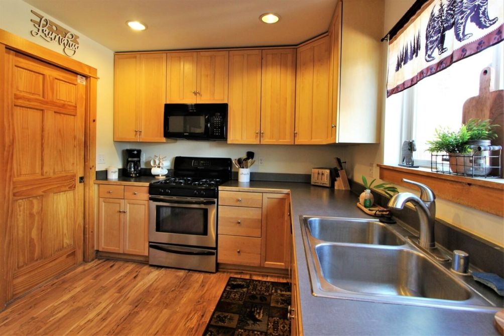 Step into the light and bright Living Room and instantly get the mountain vibe with the vaulted, knotty-pine ceilings and cozy wood-burning stove. There is plenty of comfortable seating and a large TV with cable for your entertainment. There is WiFi as well for all your devices. This is the perfect spot to kick back after a long day of mountain fun!