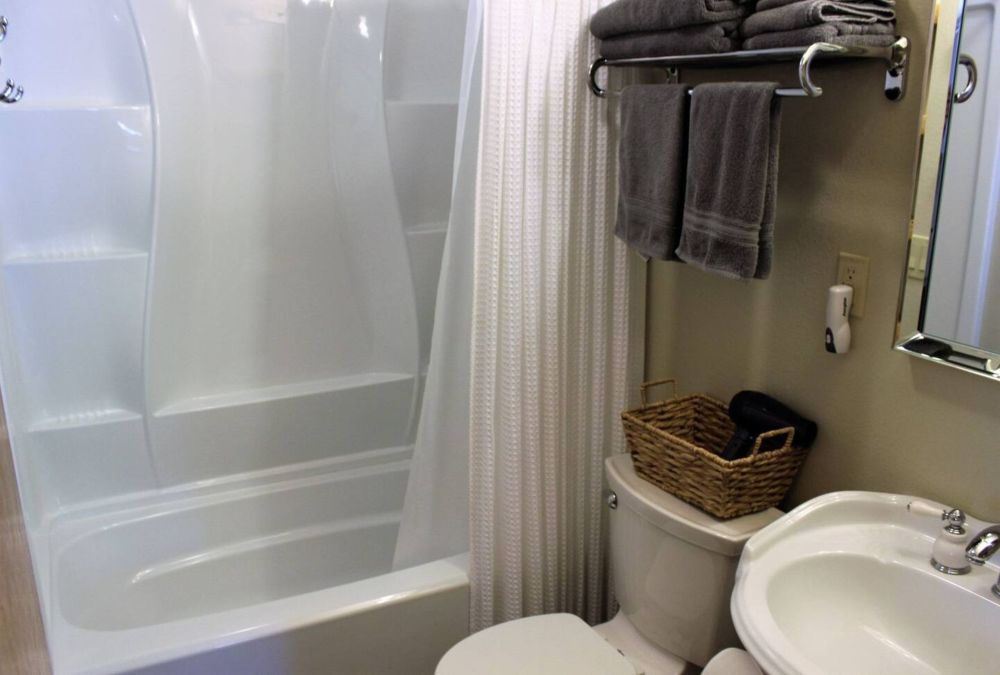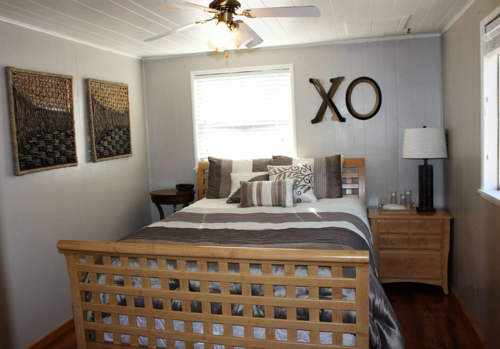 Back inside, you will find one bedroom and one full bathroom. The bedroom is light and bright, and has a comfortable Queen Bed and a ceiling fan. The bathroom has a shower-tub combo and plenty of fluffy towels. This cabin even has a stack washer/dryer for your convenience.