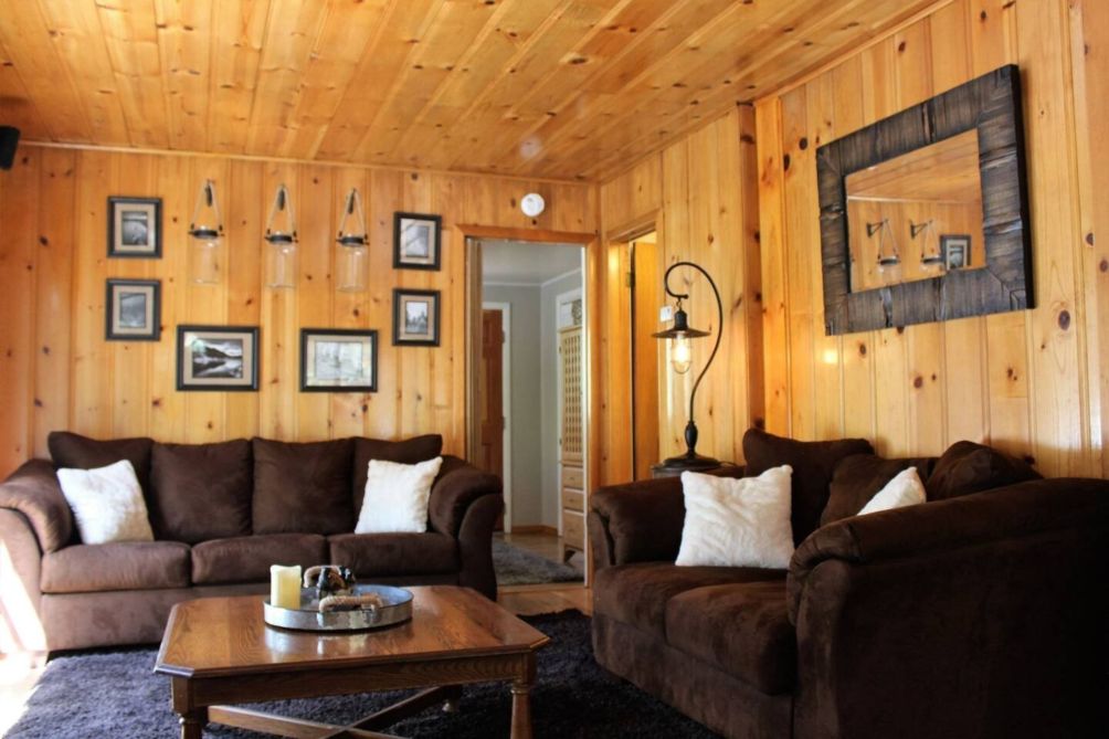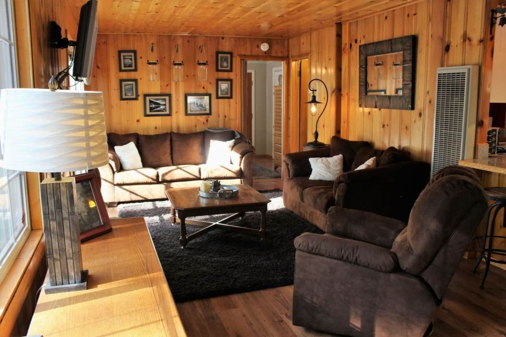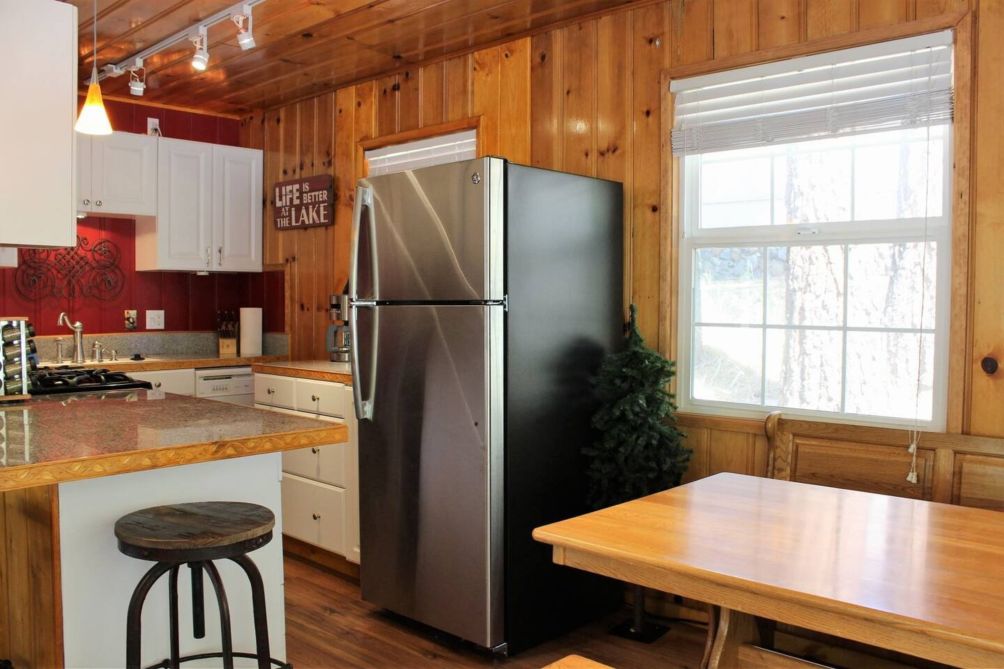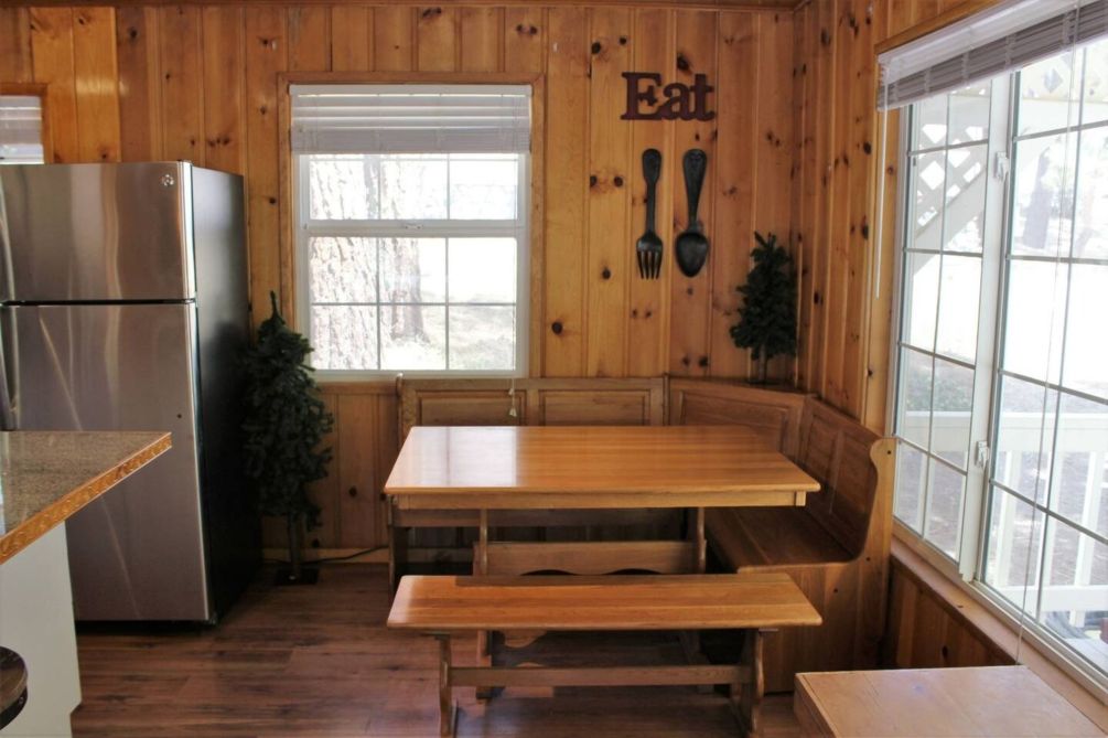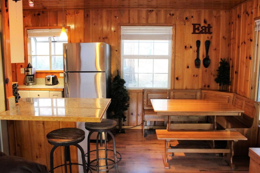 As you step into the Living Room, you are welcomed by the classic, knotty pine walls and charming mountain decor. This room features a cozy Gas Fireplace, Flat Screen TV, and plenty of comfortable seating, including a Queen Sleeper Sofa. The Kitchen features a stainless Range and Refrigerator, Dishwasher and plenty of extras to make you feel at home. The Dining Nook is the perfect place to enjoy a home-cooked meal or your morning coffee.