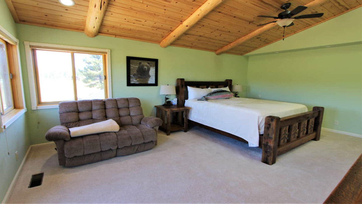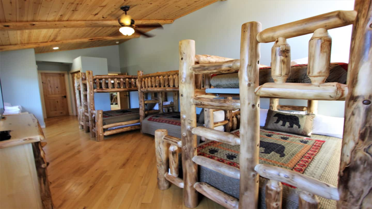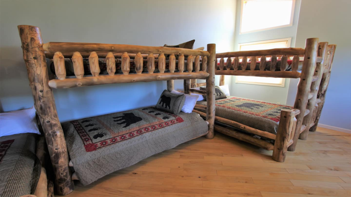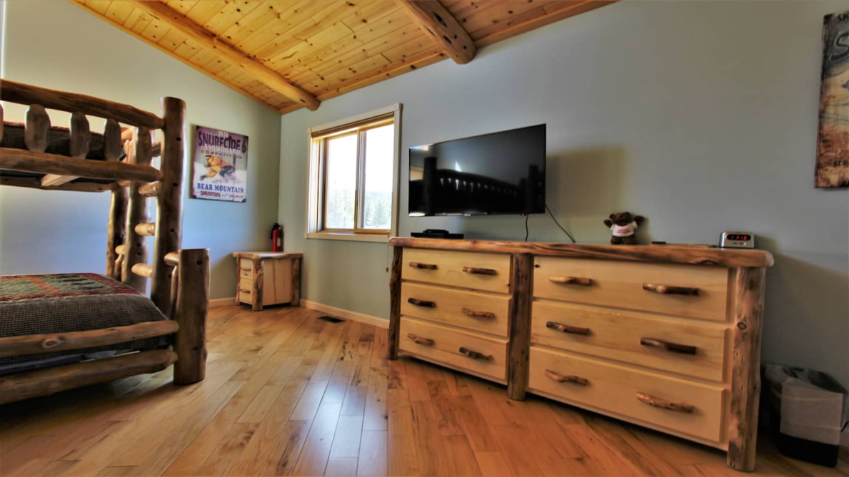 Upstairs you will find three bedrooms and three bathrooms. The master bedroom has a luxurious king bed, plus a dual-reclining loveseat and TV to enjoy before turning in. Step outside onto your private balcony and watch the sunrise with your morning coffee or sip a glass of wine before bed. The attached bathroom features two sinks, a large tub with air jets, and a separate shower. In the guest bedroom, you will find another king bed and TV and this bedroom has direct access to a full bathroom. In the final bedroom you will find three sets of log bunk beds - two sets are twin over full and one is twin over twin. There is a TV in this room as well - the perfect place for all the kids! A third full bathroom on this floor is just next door so no bedroom has to share a bath.