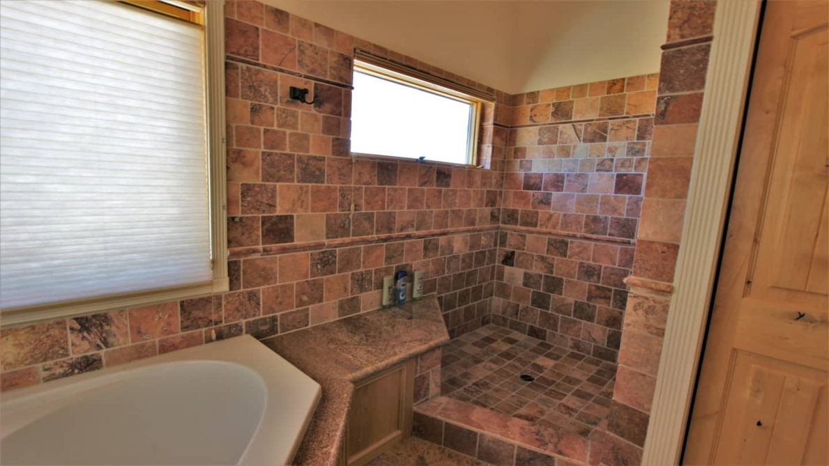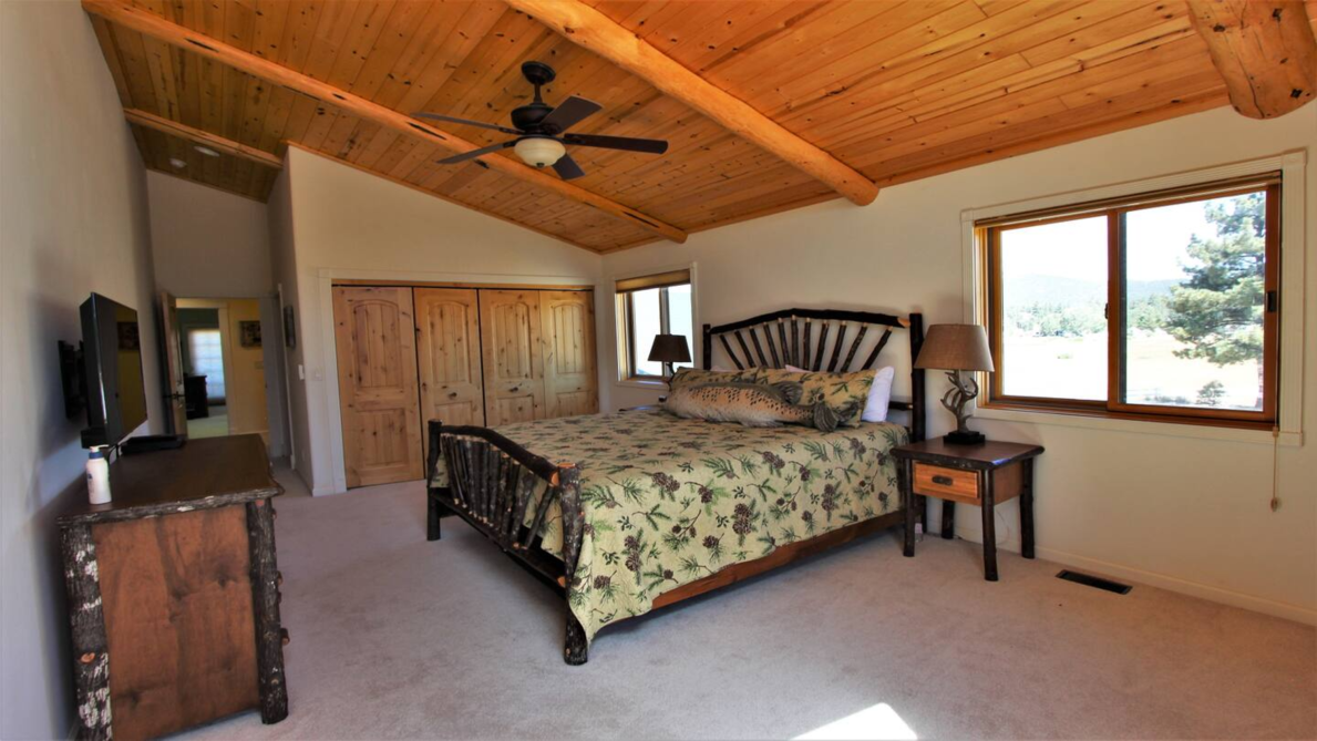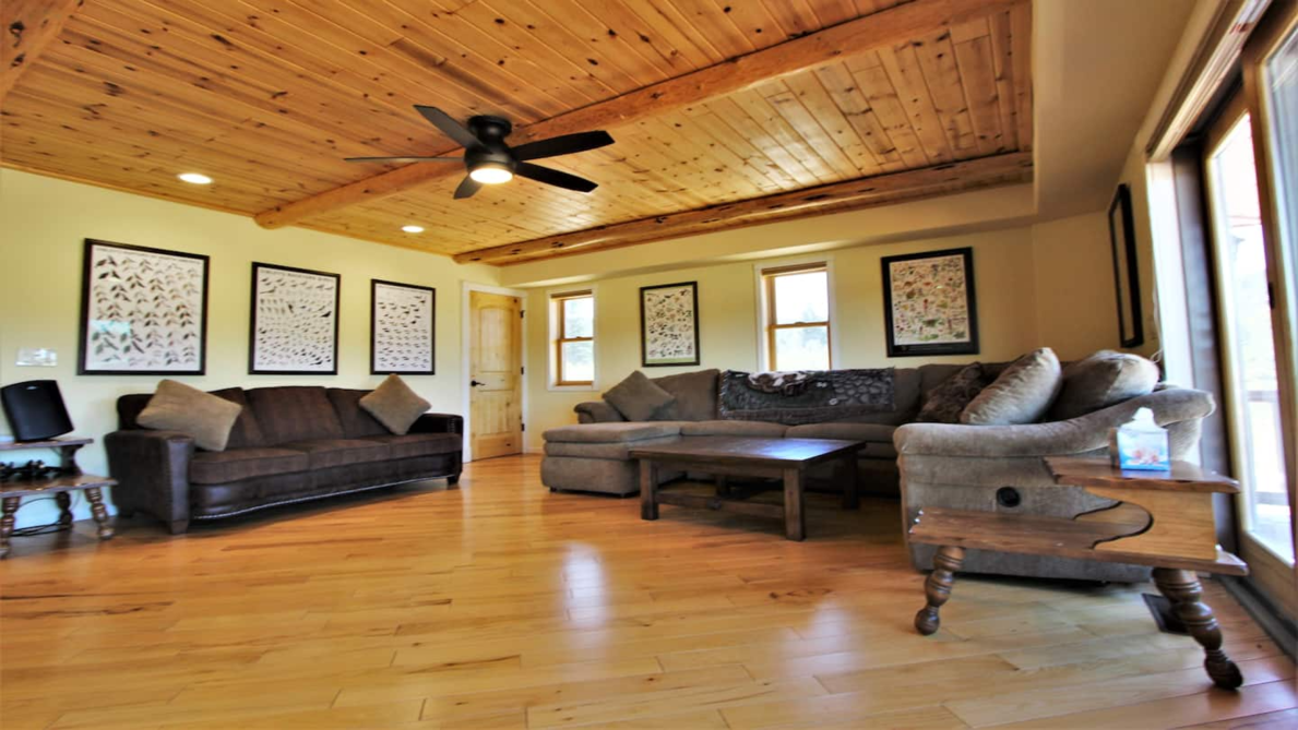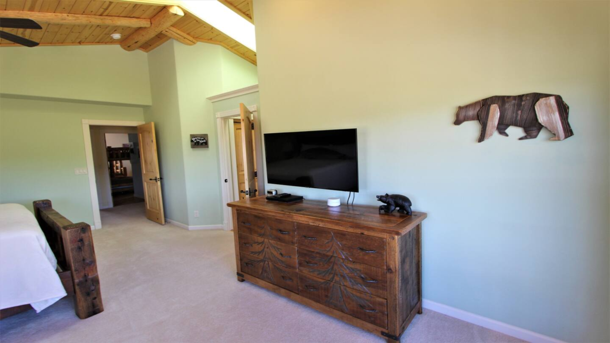 Upstairs you will find three bedrooms and three bathrooms. The master bedroom has a luxurious king bed, plus a dual-reclining loveseat and TV to enjoy before turning in. Step outside onto your private balcony and watch the sunrise with your morning coffee or sip a glass of wine before bed. The attached bathroom features two sinks, a large tub with air jets, and a separate shower. In the guest bedroom, you will find another king bed and TV and this bedroom has direct access to a full bathroom. In the final bedroom you will find three sets of log bunk beds - two sets are twin over full and one is twin over twin. There is a TV in this room as well - the perfect place for all the kids! A third full bathroom on this floor is just next door so no bedroom has to share a bath.