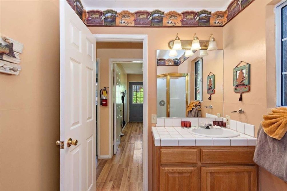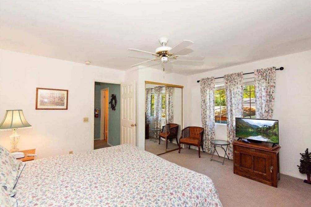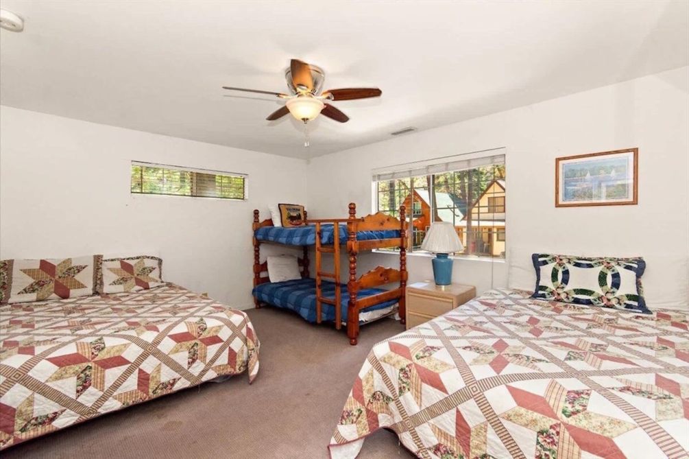 The downstairs bedroom has a King bed. Upstairs, the spacious main bedroom has a king bed with TV and Cable, and the third bedroom has 2 queen beds and a twin bunk bed. The bedrooms share another full bath. A twin bed and TV for games and DVD player in the roomy alcove allows for more sleeping versatility and game playing.